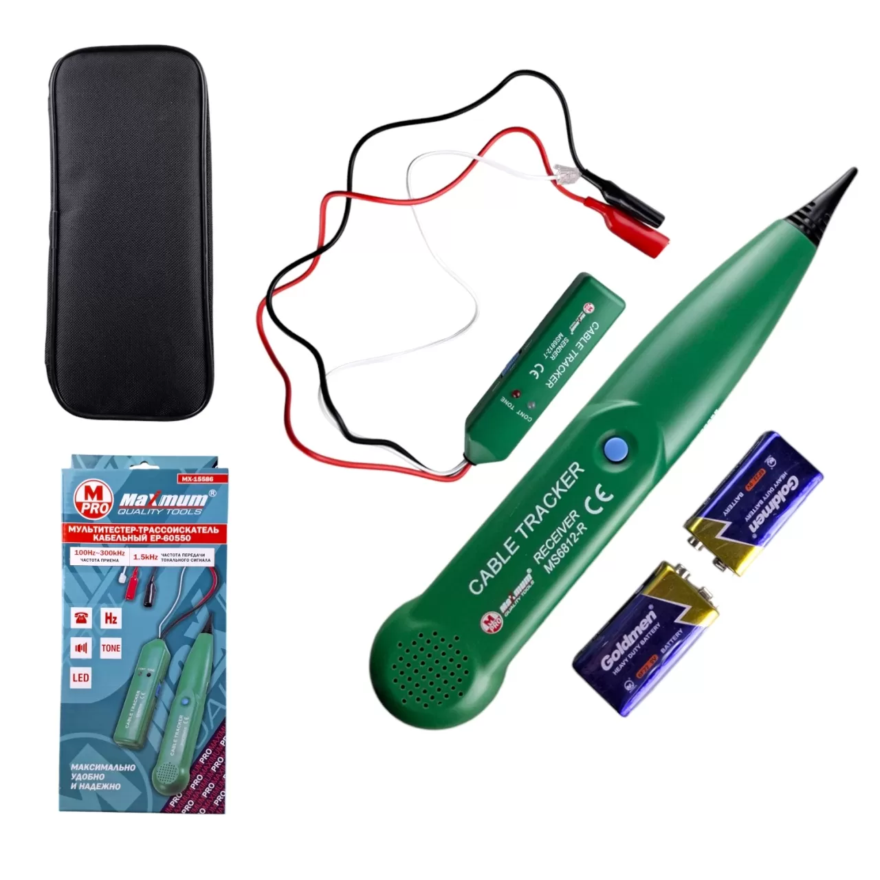 В комплект входит: передатчик, приемник, тестовые провода, чехол для переноски и руководство, батарейки, коробка.