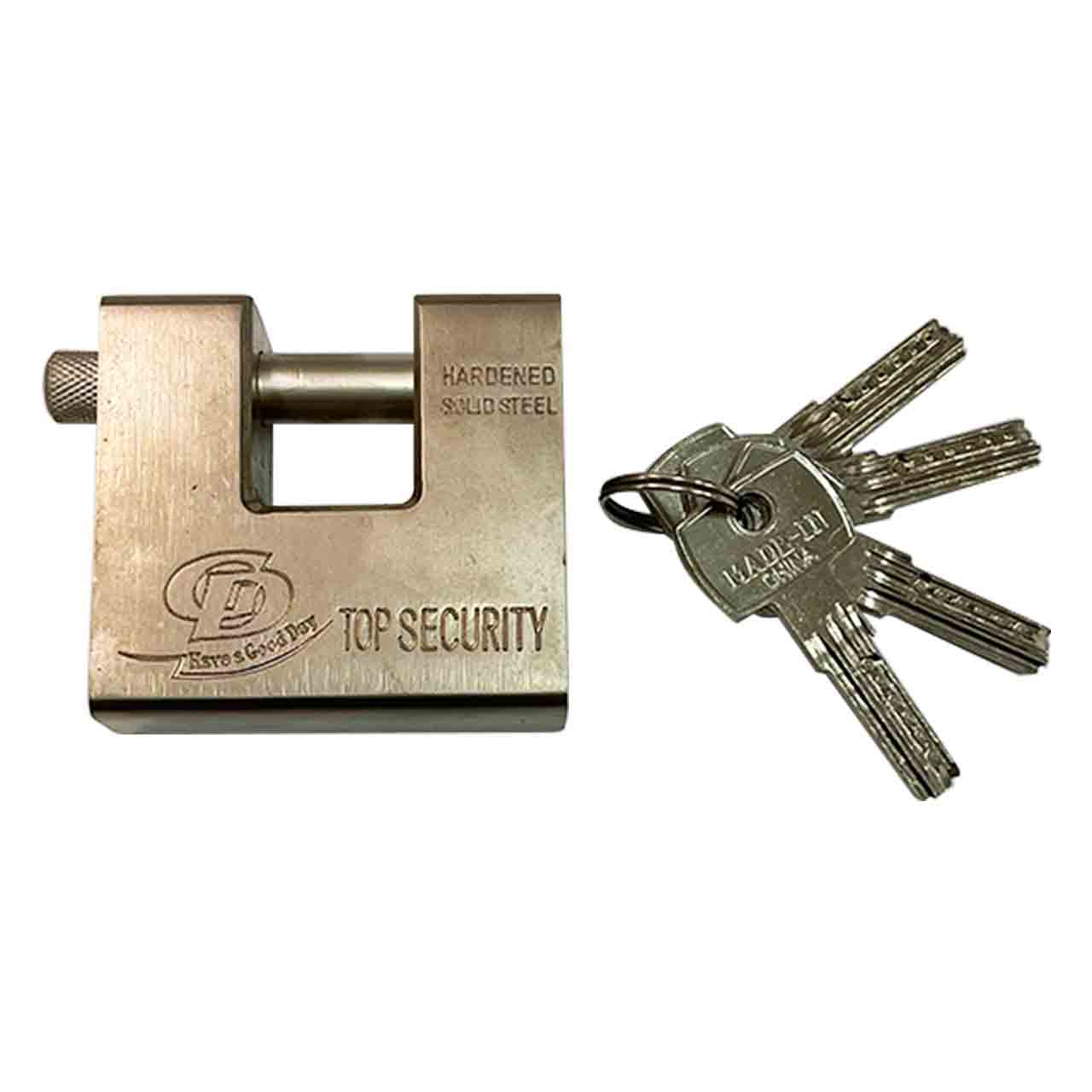 Навесной полузакрытый замок оборудован надежным цилиндровый механизмом, в дополнение к которому поставляется 4 перфорированных ключа. П-образный замок имеет прямую дужку - ригель из закаленной стали, который при закрытии углубляется в корпус.