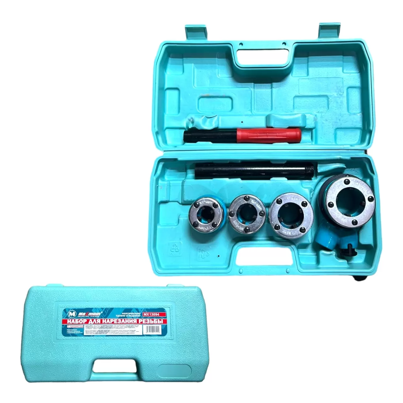 Каждая резьбонарезная головка имеет четыре отверстия для удаления стружки. Длинная ручка обеспечивает максимальное кручение при нарезании резьбы. Набор поставляется с пластиковой коробкой, что позволяет удобно транспортировать и хранить инструменты. Головки для нарезания резьбы изготовлены из чугуна, прочного и износостойкого. Резьбовая плашка: 1/2", 3/4", 1", 1-1/4" Тип резьбы: цилиндрическая трубная резьба 55 °.